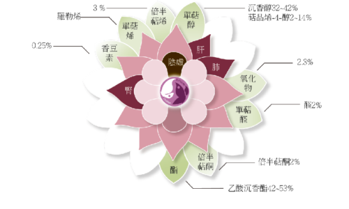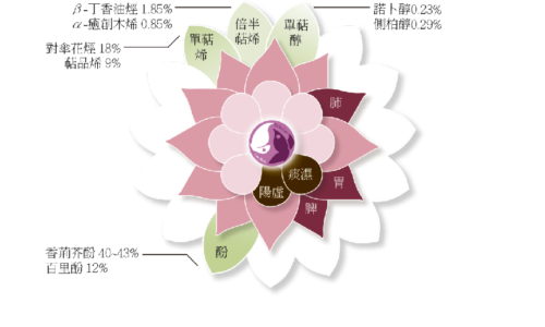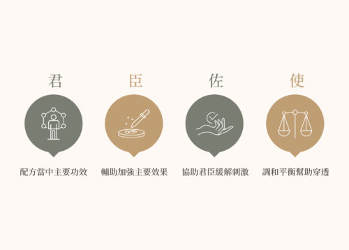 在君臣佐使這個東方哲學概念裡我們再做一次的剖析,其中代表“君”的是波旁天竺葵,它在這整個配方裡面比例不高,但它是最主要的功效,因為它可以促進循環、抗菌功效顯著,同時具有花香氣。