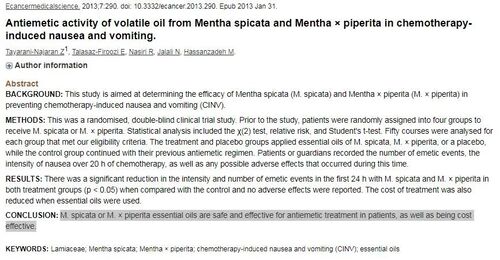 ▸ Tayarani-Najaran Z 等,在2013年癌症醫學研究發現,胡椒薄荷精油對化療誘發的噁心和嘔症狀有相關的研究。