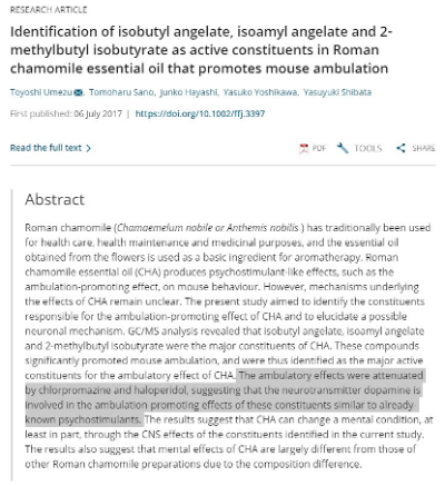 ▸ 從GC/MS分析出歐白芷酸異丁酯(Isobutyl angelate),歐白芷酸異戊酯(Isoamyl angelate)和異丁酸2-甲基丁酯(2‐methylbutyl isobutyrate)是羅馬洋甘菊的主要成分,且這些化合物顯著促進了小鼠的活動,因此被確定為羅馬洋甘菊精油(CHA)的主要活性成分。研究中也顯示活性成分與神經傳遞物質多巴胺相似。