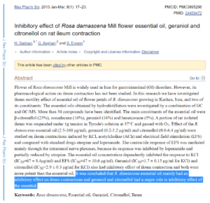 10. Sadraei, H., G. Asghari, and S. Emami., "Inhibitory effect of Rosa damascena Mill flower essential oil, geraniol and citronellol on rat ileum contraction.," Research in Pharmaceutical Sciences, vol. 1, no. 8, p. 17, 2013.