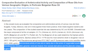 11. Gochev, Velizar, et al., "Comparative evaluation of antimicrobial activity and composition of rose oils from various geographic origins, in particular Bulgarian rose oil.," Natural Product Communications, vol. 7, no. 3, p. 1934578X0800300706, 2008.