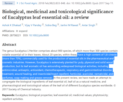 1. Ashok K Dhakad et al. Biological, medicinal and toxicological significance of Eucalyptus leaf essential oil: a review. J Sci Food Agric. 2018 Feb;98(3):833-848.