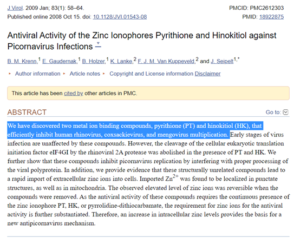 - Krenn BM, GaudernakE, Holzer B, Lanke K, Van Kuppeveld FJ, Seipelt J (January 2009). "Antiviral activity of the zinc ionophores pyrithione and hinokitiola against picornavirus infections". Journal of Virology. 83 (1): 58–64 .