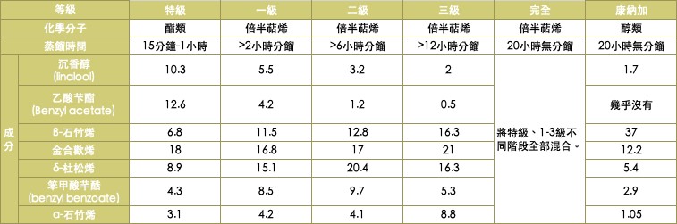 依蘭優美的枝條隨風搖曳,藏在枝條裡的黃色花朵幽幽散發著濃鬱強烈的香氣,因此依蘭又稱為香水樹,深受許多調香師的喜愛,萃取自花朵,且其萃取方式相當特殊,透過不同的時間作分餾,隨著先後順序分為特級(Extra)、一級(One)、二級(Two)、三級(Three )依蘭。