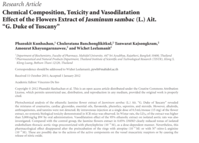 - Phanukit Kunhachan et al. Chemical Composition, Toxicity and Vasodilatation Effect of the Flowers Extract of Jasminum sambac (L.) Ait. “G. Duke of Tuscany”. March 2012.Evidence-based Complementary and Alternative. Medicine 2012(4):471312