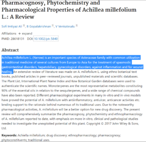 7. Ali SI, Gopalakrishnan B, Venkatesalu V. Pharmacognosy, Phytochemistry and Pharmacological Properties of Achillea millefolium L.: A Review. Phytother Res. 2017 Aug;31(8):1140-1161.