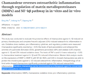 1. Ding Ma , Jinlong He , Dapeng He. Chamazulene reverses osteoarthritic inflammation through regulation of matrix metalloproteinases (MMPs) and NF-kβ pathway in in-vitro and in-vivo models. Biosci Biotechnol Biochem. 2020 Feb;84(2): 402-410.