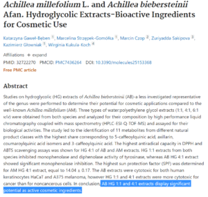3. Gaweł-Bęben K, Strzępek-Gomółka M, Czop M, Sakipova Z, Głowniak K, Kukula-Koch W. Achillea millefolium L. and Achillea biebersteinii Afan. Hydroglycolic Extracts-Bioactive Ingredients for Cosmetic Use.Molecules. 2020 Jul 24; 25(15):3368.