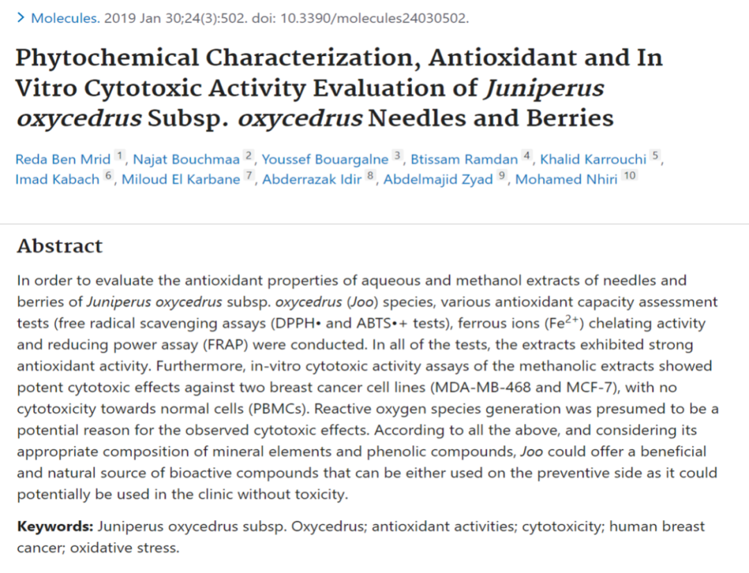 4. Ben Mrid R, et al. Phytochemical Characterization, Antioxidant and In Vitro Cytotoxic Activity Evaluation of Juniperus oxycedrus Subsp. oxycedrus Needles and Berries. Molecules. 2019. Jan 30;24(3):502.