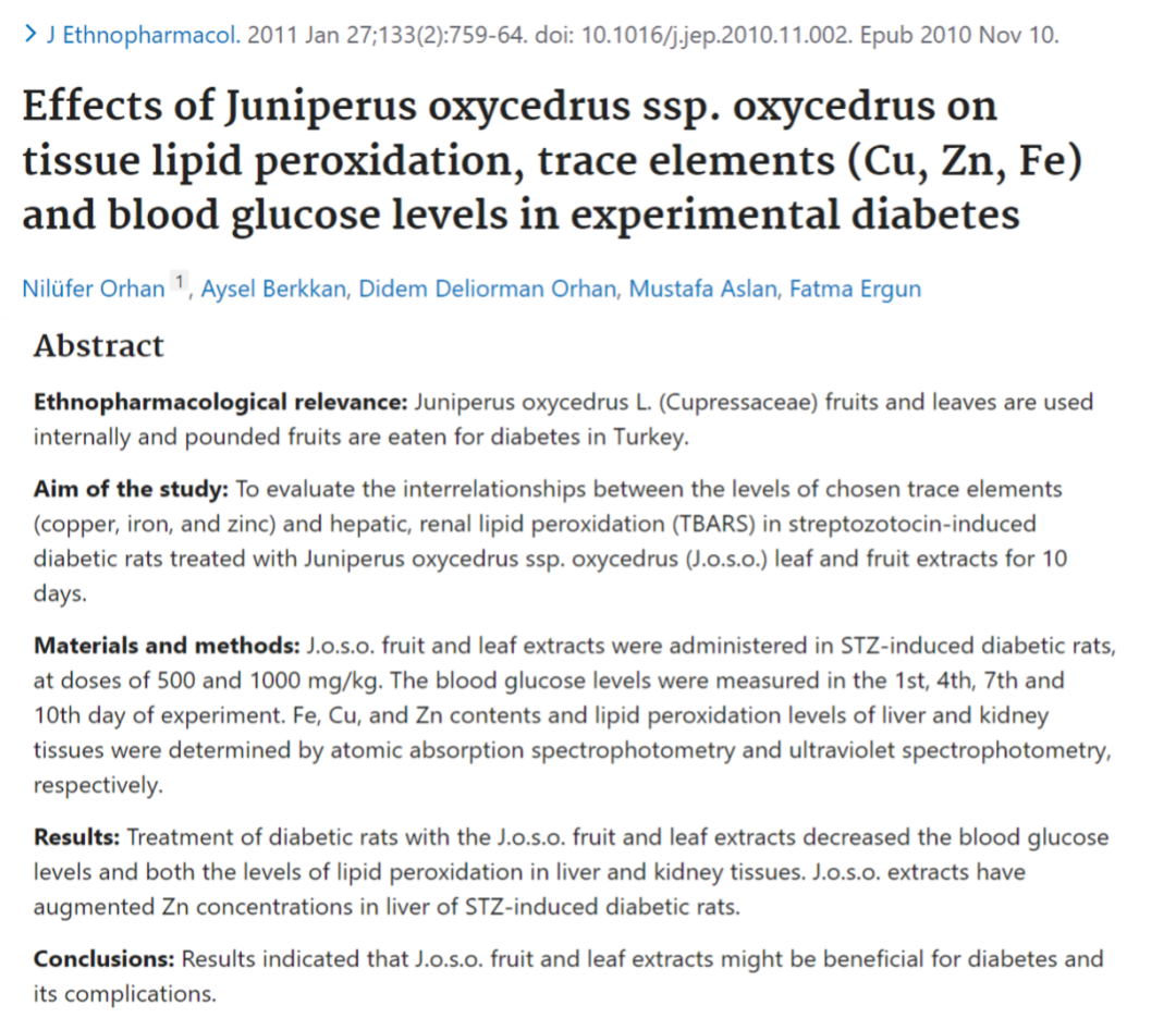 10. Orhan N, et al. Effects of Juniperus oxycedrus ssp. oxycedrus on tissue lipid peroxidation, trace elements (Cu, Zn, Fe) and blood glucose levels in experimental Janabetes. J Eth din); 759-64.