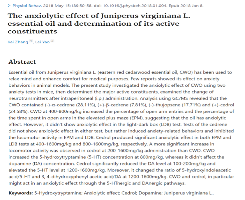 6. Zhang K, et al. The anxiolytic effect of Juniperus virginiana L. essential oil and determination of its active constituents. Physiol Behav. 2018. May 15;189:50-58.