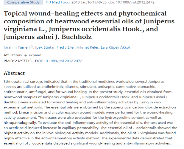 11. Tumen I, et al. Topical wound-healing effects and phytochemical composition of heartwood essential oils of Juniperus virginiana L., Juniperus occidentalis Hook., and Juniperus ashei J. Buchholz. Jiperus occidentalis Hook., and Juniperus ashei J. Buchholz. J Med Food.2013); :48-55.