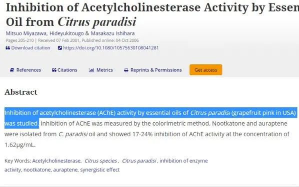▸ 2001年,發現葡萄柚精油對於乙酰膽鹼酯酶的活性有相關的研究,並從中發現其特殊倍半萜酮的成分Nootkatone及Auraptene在1.62μg/mL具有抑制17-24%的活性。