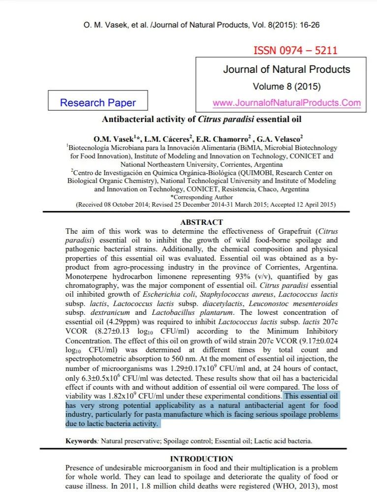 - Vasek, OM, et al., "Antibacterial activity of Citrus paradisi essential oil.," Journal of Natural Products, no. 8, pp. 16-26, 2015.