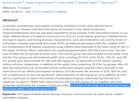 Juniperus communis Linn oil decreases oxidative stress and increases antioxidant enzymes in the heart of rats administered a diet rich in cholesterol. Toxicol Ind Health. 2015 Jan;31(1):85-91.