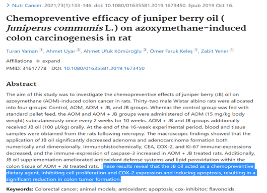 1. Turan Yaman , Ahmet Uyar , Ahmet Ufuk Kömüroğlu , Ömer Faruk Keleş , Zabit Yener. Chemopreventive efficacy of juniper berry oil ( Juniperussis communis L.) on azoxymethane-induced corat carcinor. 133-146