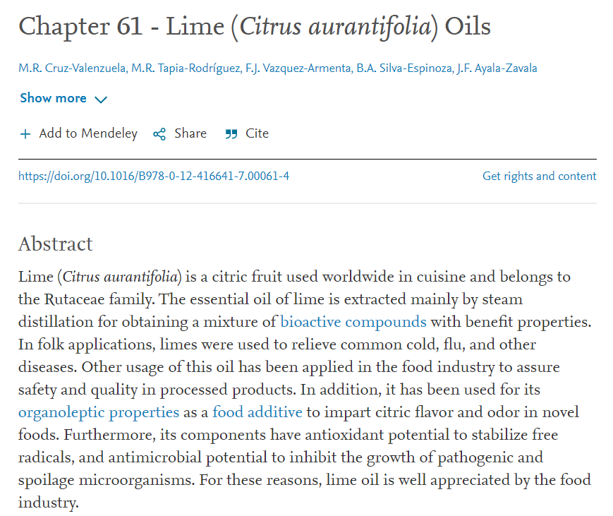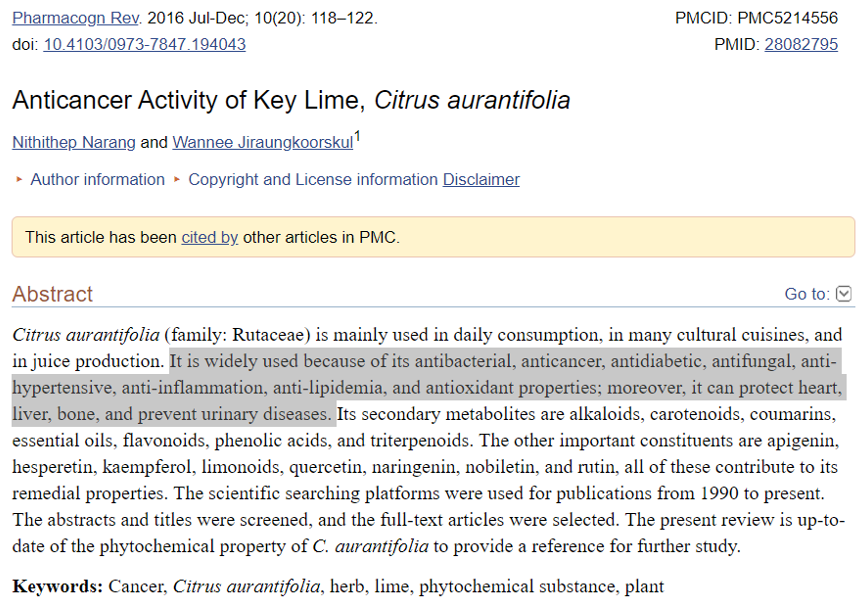 - Nithithep Narang and Wannee Jiraungkoorskul. Anticancer Activity of Key Lime, Citrus aurantifolia. Pharmacogn Rev. 2016 Jul-Dec; 10(20): 118–122.