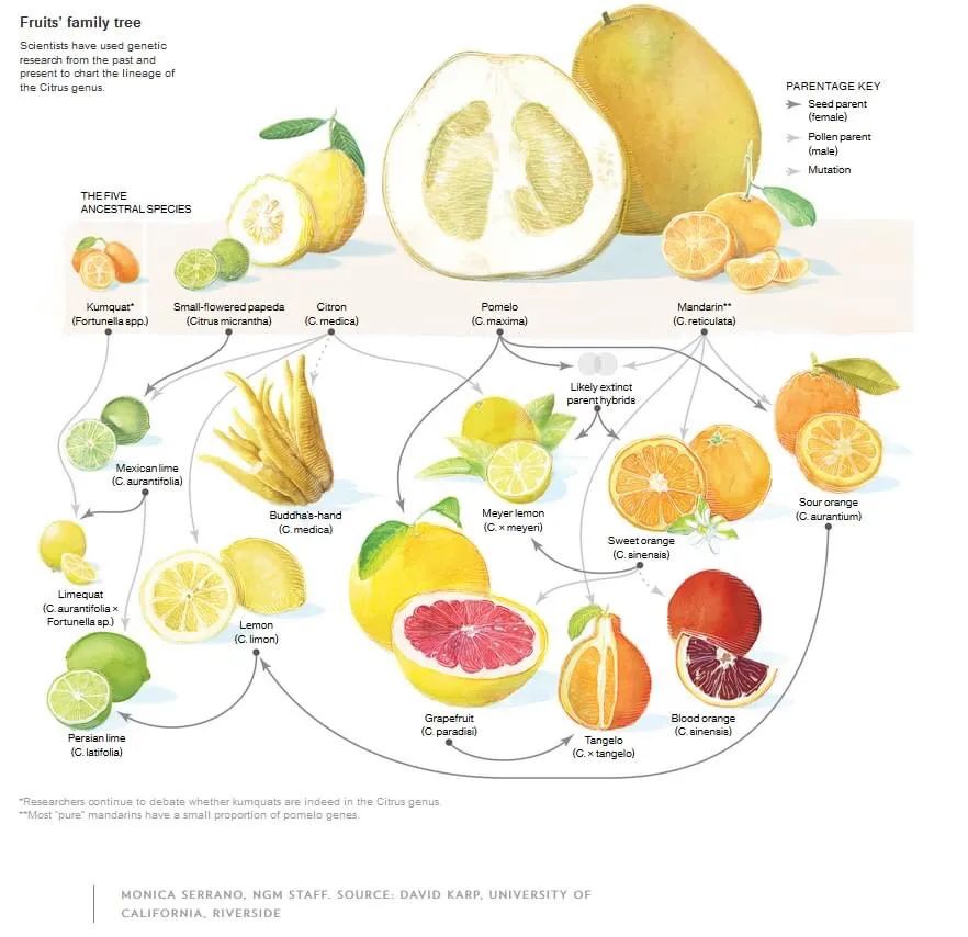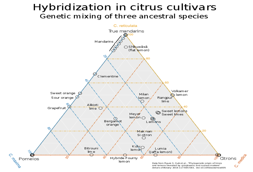 ▸ 柑橘類水果經由遺傳相似性聚集。柑橘的大部分品種是圖標三角處的三個物種的雜種。遺傳上不同的雜種通常具有相同的通用名稱。