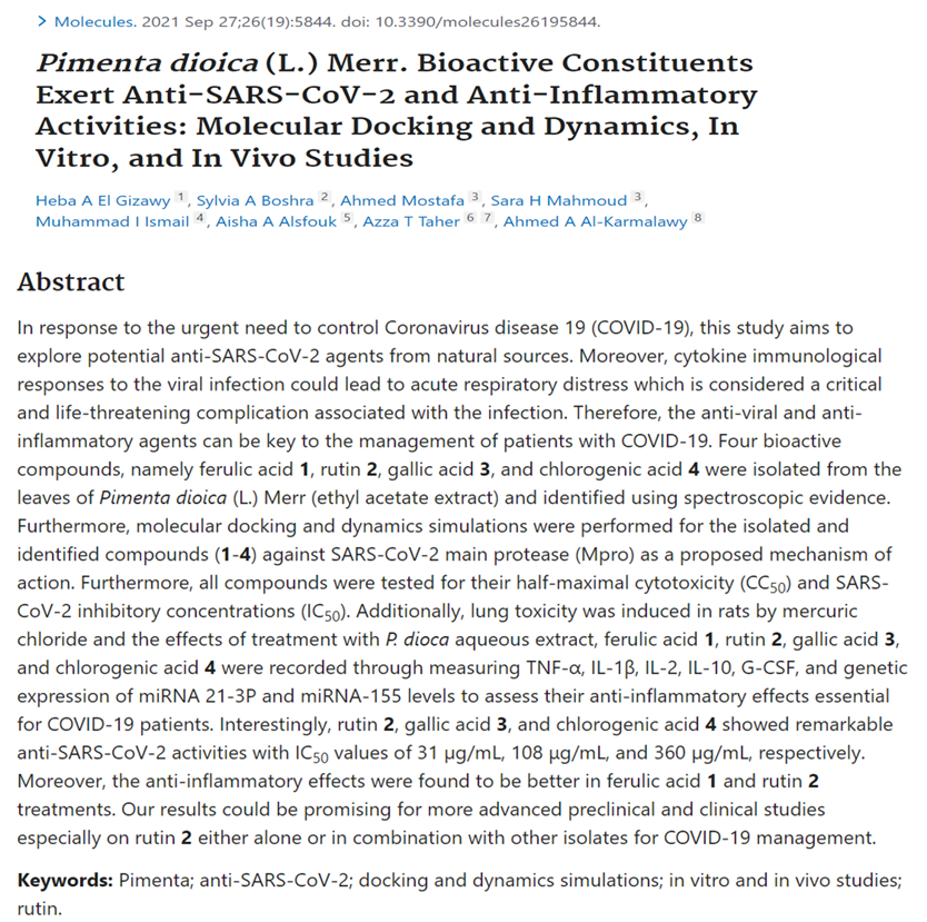 - El Gizawy HA, et al. Pimenta dioica (L.) Merr. Bioactive Constituents Exert Anti-SARS-CoV-2 and Anti-Inflammatory Activities: Molecular Docking and Dynamics, In Vitro, and In Vivo Studies. Molecules. 2021. Sep 27;26(19):5844.