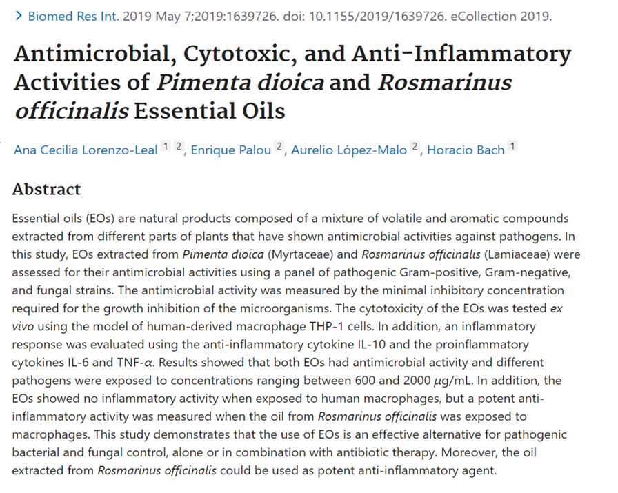 - Lorenzo-Leal AC, et al. Antimicrobial, Cytotoxic, and Anti-Inflammatory Activities of Pimenta dioica and Rosmarinus officinalis Essential Oils. Biomed Res Int. 2019. May 7;2019:1639726.