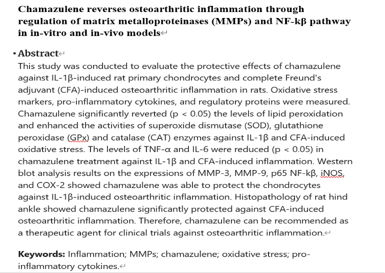 - Ma D, He J, He D. Chamazulene reverses osteoarthritic inflammation through regulation of matrix metalloproteinases (MMPs) and NF-kbeta pathway in in-vitro and in-vivo models. Biosci Biotechnol Biochem. 2020 Feb;84(2):402-410.