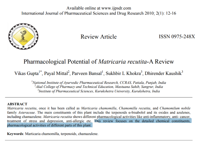 - Gupta, Vikas, et al., "Pharmacological potential of Matricaria recutita-A review.," Int J Pharm Sci Drug Res, vol. 1, no. 2, pp. 12-16, 2010.