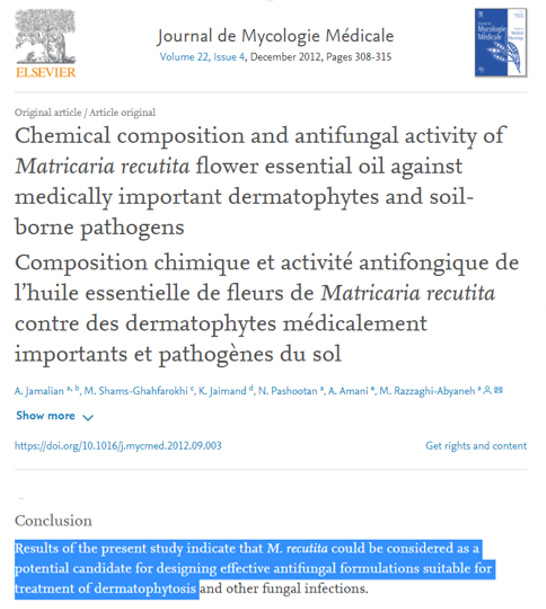 - Jamalian, A., et al., "Chemical composition and antifungal activity of Matricaria recutita flower essential oil against medically important dermatophytes and soil-borne pathogens.," Journal de mycologie medicale and soil-borne pathogens.," Journal de mycologie 5, no. . 308-315, 2012.