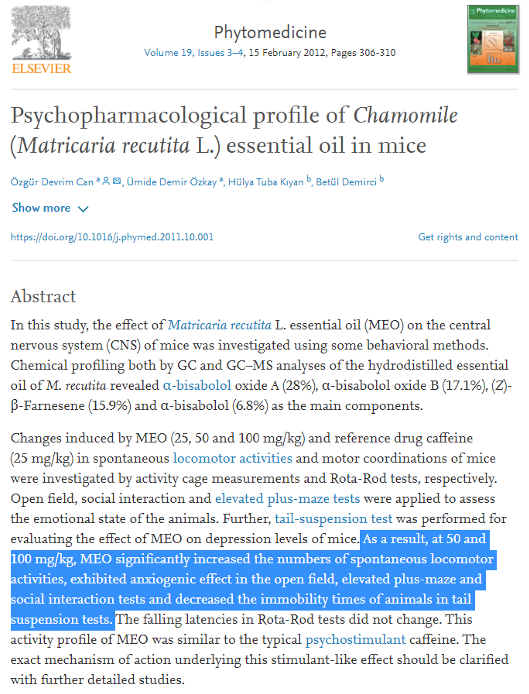 - Can, Özgür Devrim, et al. , "Psychopharmacological profile of Chamomile (Matricaria recutita L.) essential oil in mice.," Phytomedicine, Vols. 3-4, no. 19, pp. 306-310, 2012.