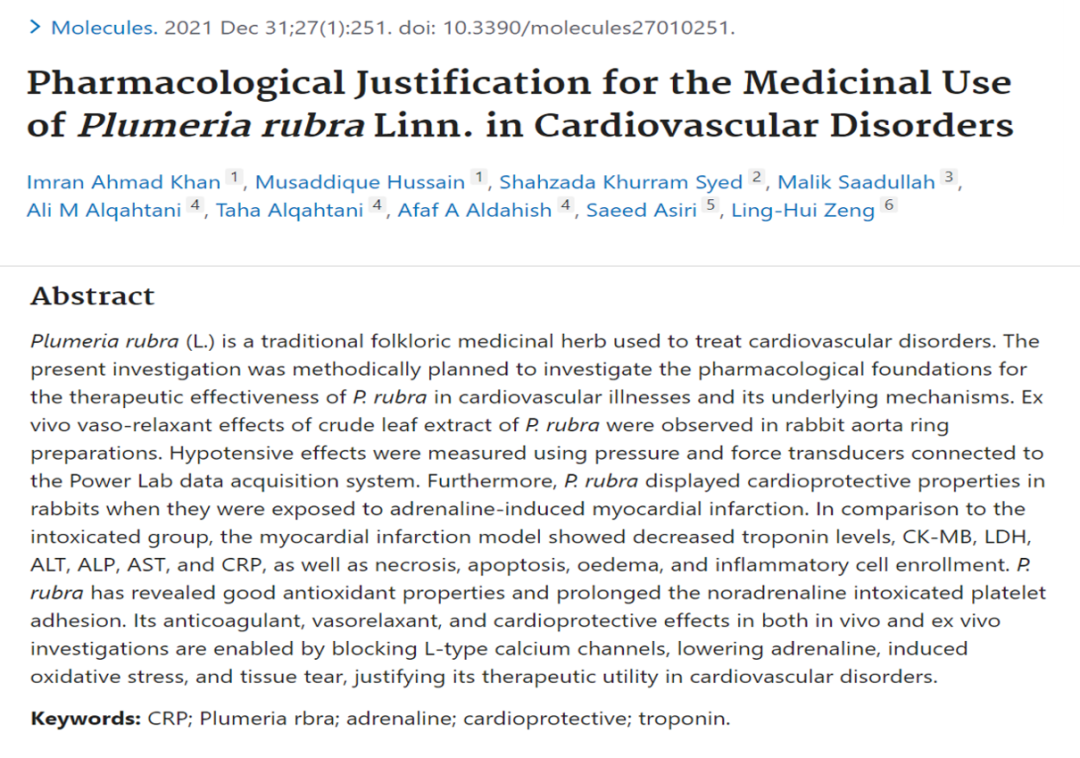 - Khan IA, et al. Pharmacological Justification for the Medicinal Use of Plumeria rubra Linn. in Cardiovascular Disorders. Molecules. 2021. Dec 31;27(1):251.