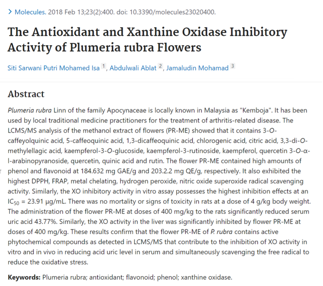 - Mohamed Isa SSP, et al. The Antioxidant and Xanthine Oxidase Inhibitory Activity of Plumeria rubra Flowers. Molecules. 2018. Feb 13;23(2):400.