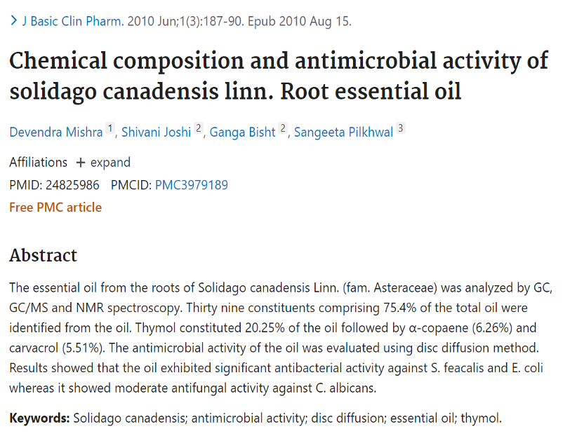 - Mishra D, Joshi S, Bisht G, Pilkhwal S. Chemical composition and antimicrobial activity of solidago canadensis linn. Root essential oil. J Basic Clin Pharm. 2010 Jun;1(3):187-90.