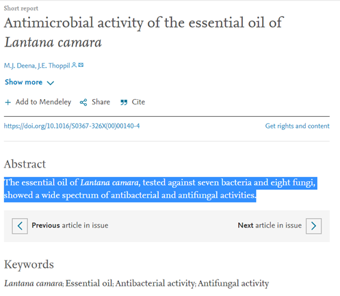 - Adulticidal activity of essential oil of Lantana camara leaves against mosquitoes. Indian J Med Res. 2010 Mar;131:434-9.