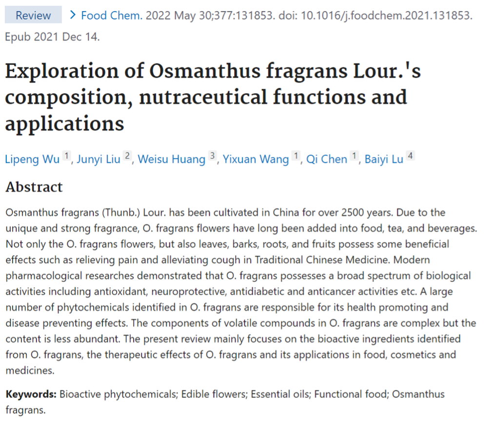 - Wu L, et al. Exploration of Osmanthus fragrans Lour.'s composition, nutraceutical functions and applications. Food Chem. 2022. May 30;377:131853.