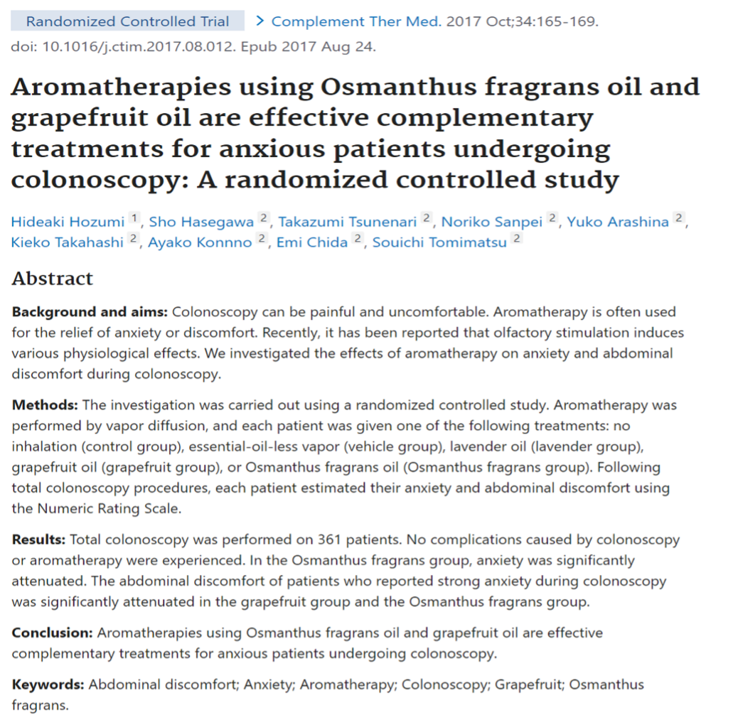 - Hozumi H, et al. Aromatherapies using Osmanthus fragrans oil and grapefruit oil are effective complementary treatments for anxious patients undergoing colonoscopy: A randomized controlled study. Complement Ther Med. 2017. Oct;34:165-169.