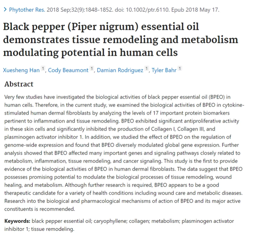 ▸黑胡椒精油在人體細胞中表現對於細胞修復和代謝調節有相關的研究。