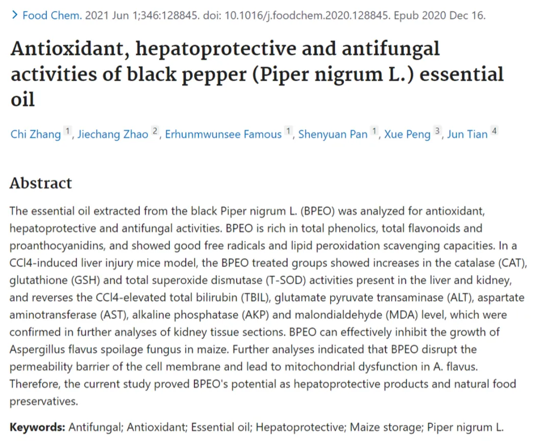 2. Zhang C, et al. Antioxidant, hepatoprotective and antifungal activities of black pepper (Piper nigrum L.) essential oil. Food Chem. 2021. Jun 1;346:128845.