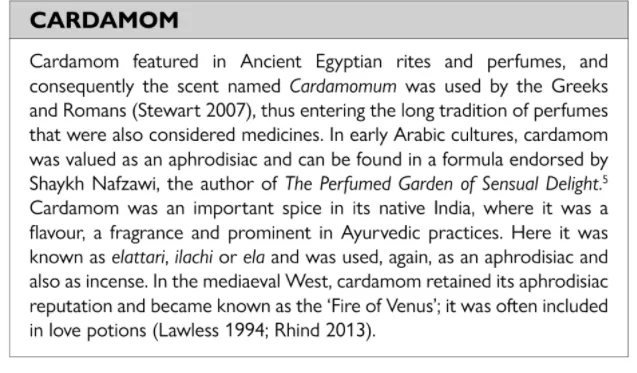 荳蔻也像其他芳香植物如橙花一樣,被認為有增進伴侶間的感情作用,不過其效果不如其他植物強大,通常需要並用其他香料。荳蔻在中世紀被稱為「維納斯之火」,是當時的愛情靈藥。在西藏,它是一種用來療養焦慮的藥材。