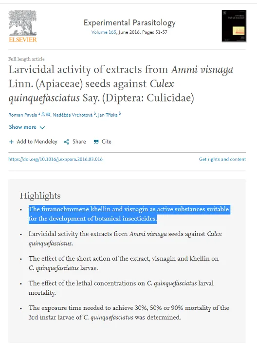 13. RNV a. JT Pavela, "Larvicidal activity of extracts from Ammi visnaga Linn.(Apiaceae) seeds against Culex quinquefasciatus Say.(Diptera: Culicidae).," Experimental parasitology, vol. 165, pp. 51-57, 2016 .